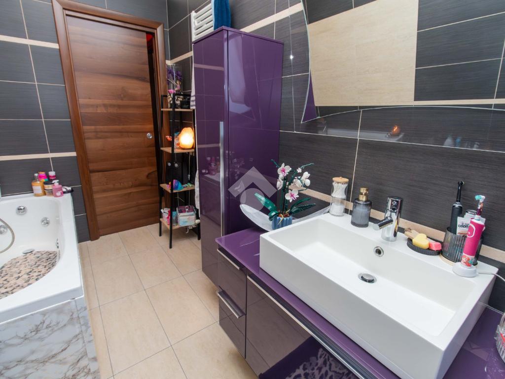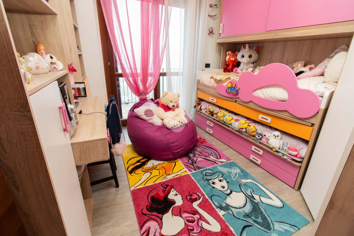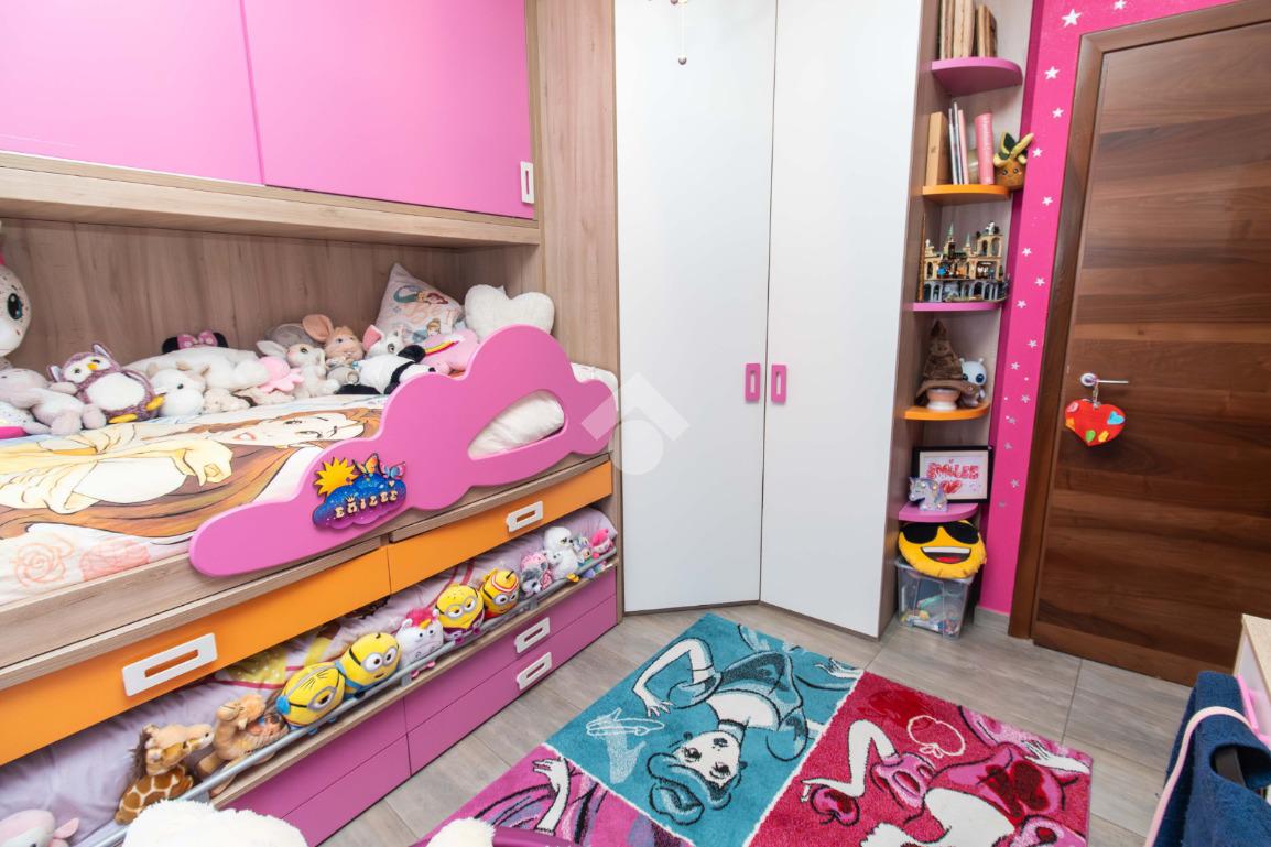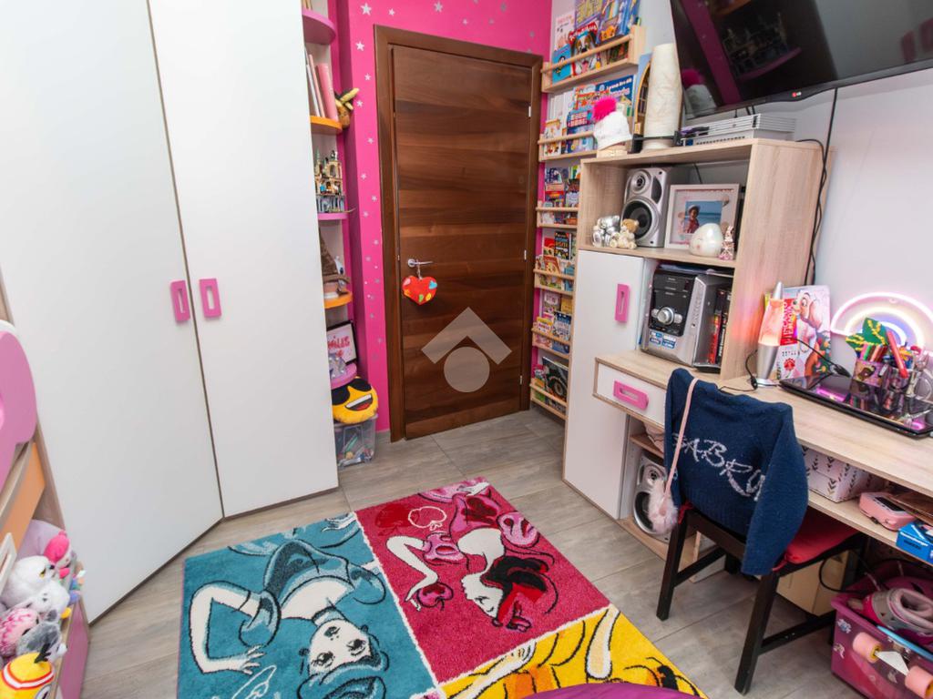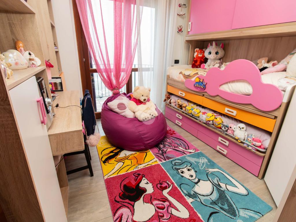 La zona notte, ben disimpegnata, ospita due camere da letto: una matrimoniale accogliente e una cameretta versatile, entrambe con affaccio su un balcone riservato. I due bagni garantiscono praticità e comfort, mentre il ripostiglio aggiunge uno spazio prezioso per l’organizzazione della casa.
