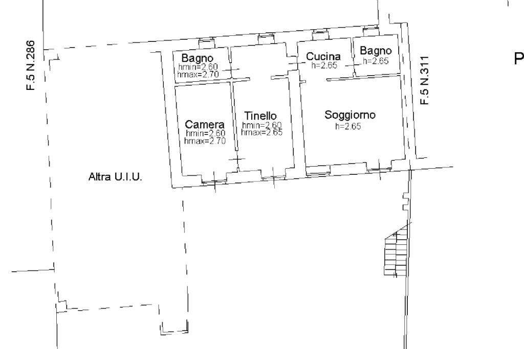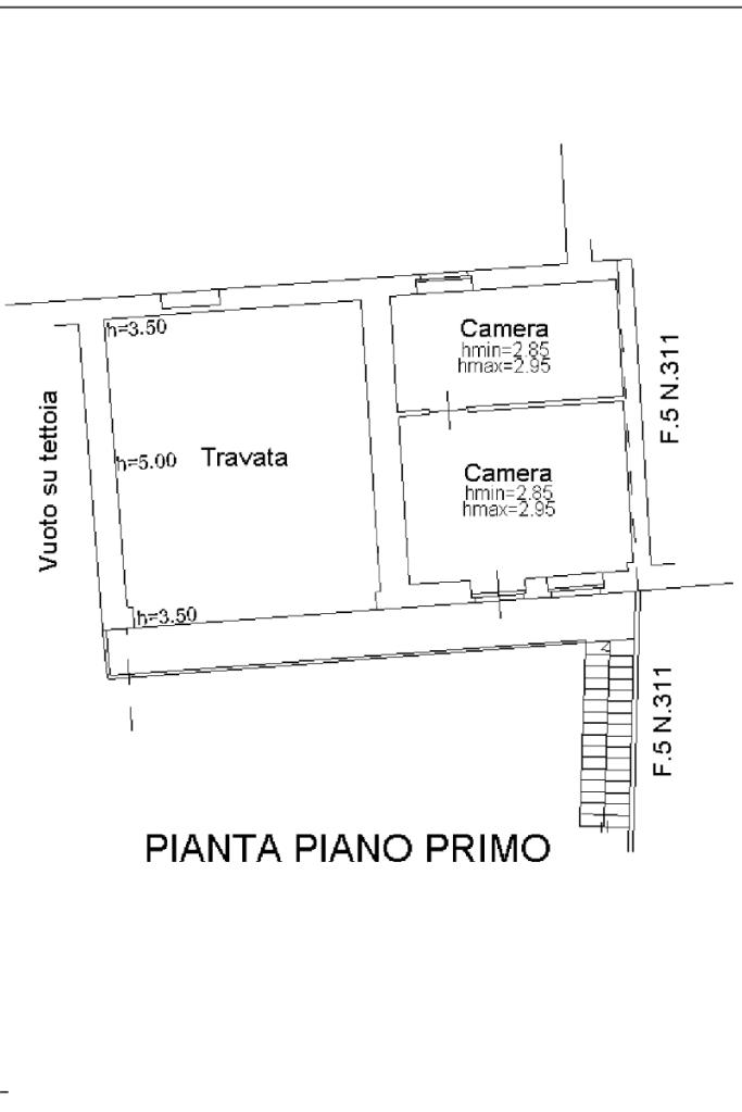 Al piano terra troviamo soggiorno, cucina, bagno, due camere e ulteriore servizio. Al piano primo sono presenti due camere, travata e tettoia di circa 75 mq, ideale come spazio accessorio, deposito o per eventuale ampliamento abitativo.