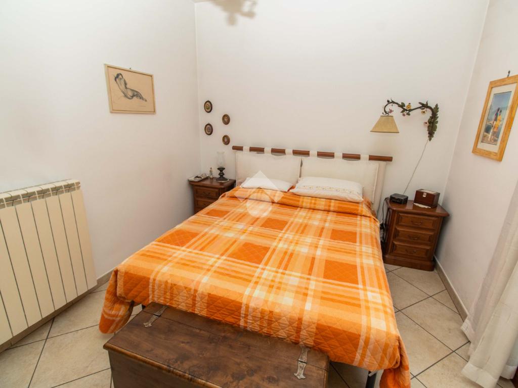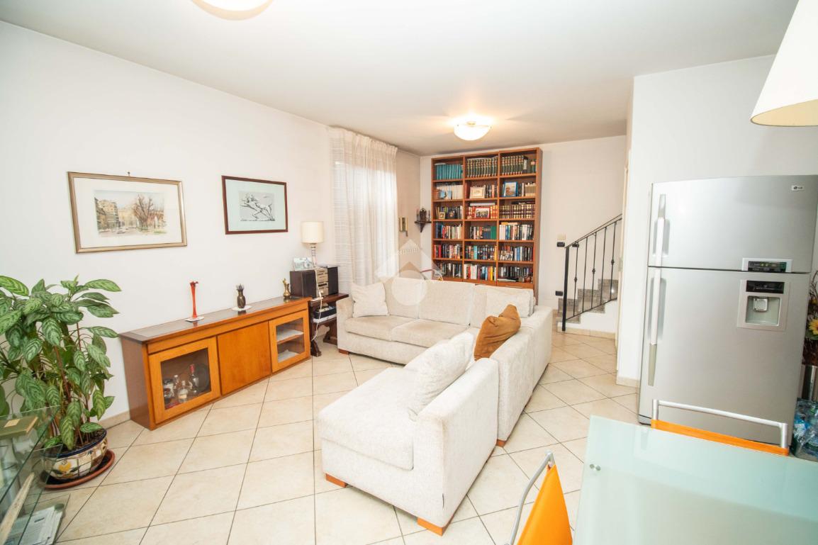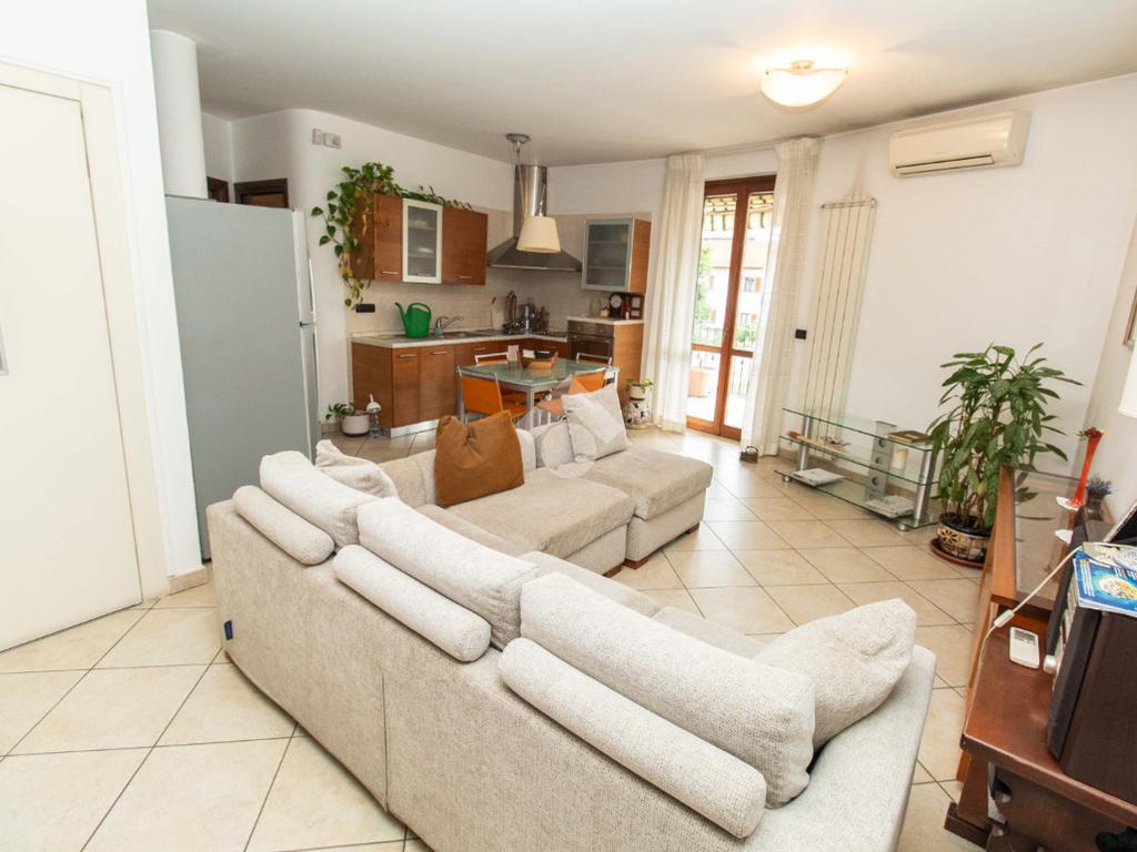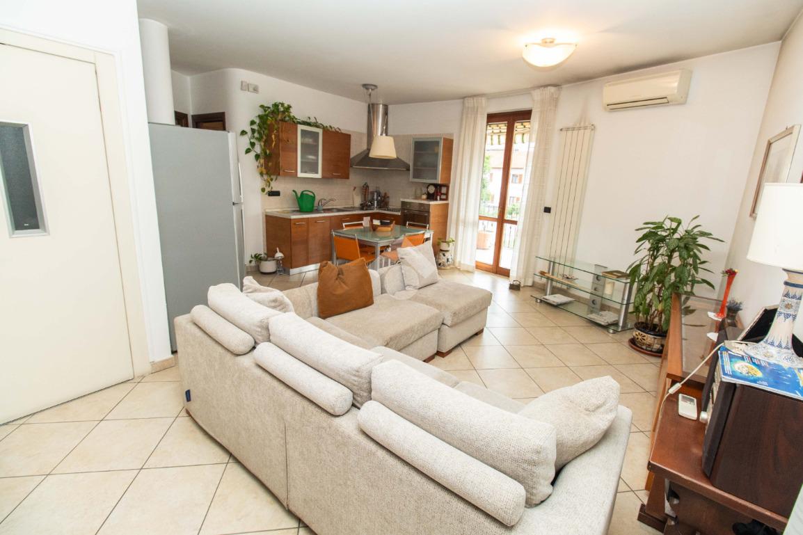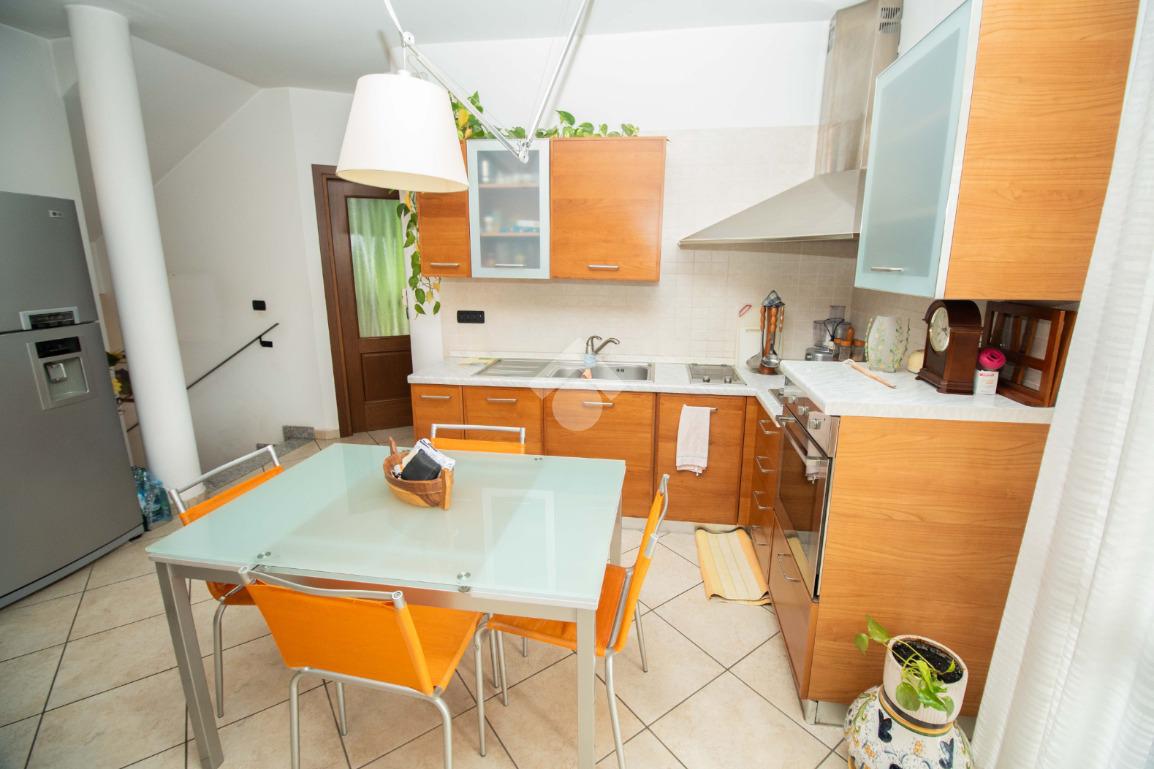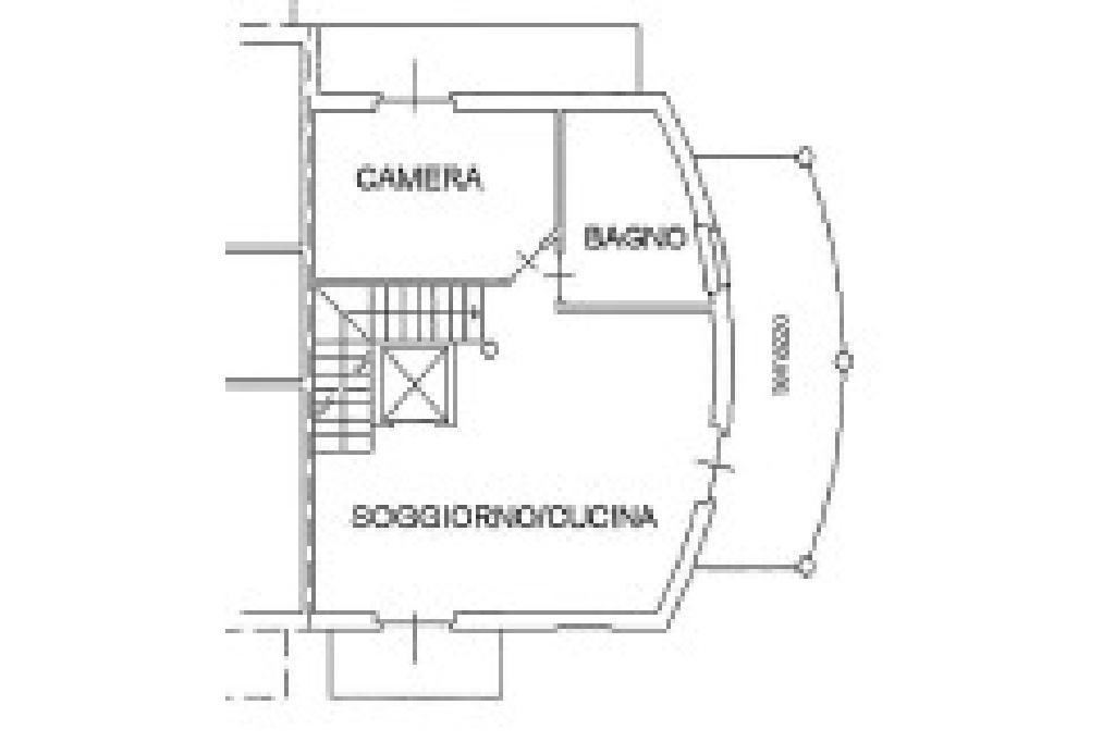 Al primo piano, soggiorno con cucina a vista, illuminato da due porte finestre e terrazzo completo di tende da sole. Sullo stesso livello troviamo un bagno finestrato con doccia e doppio lavabo, e una camera matrimoniale con affaccio sul balcone.