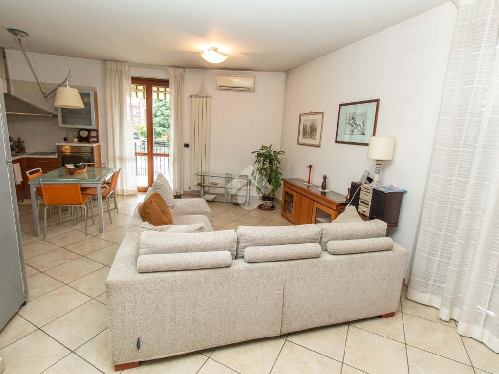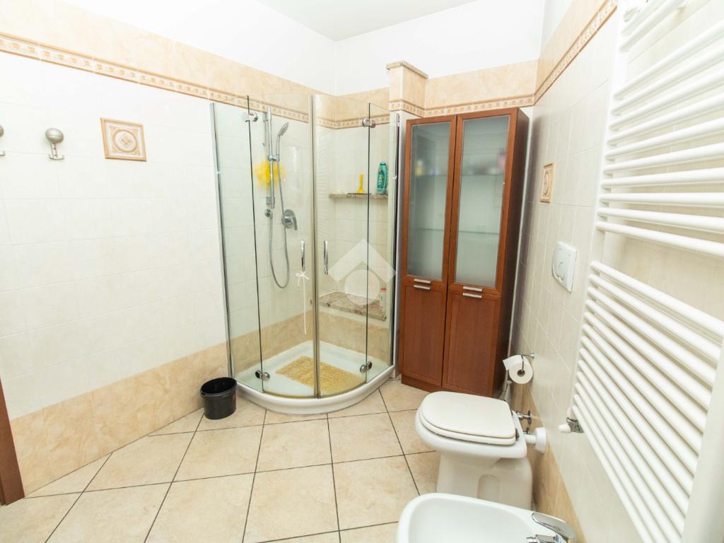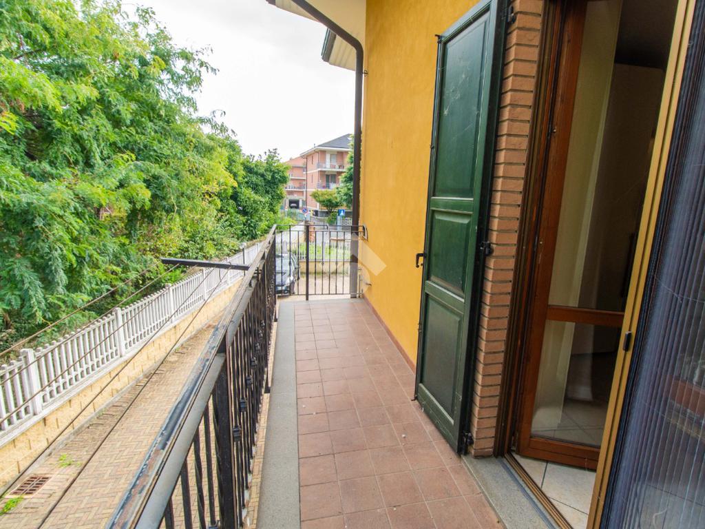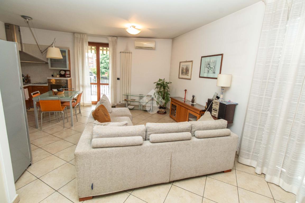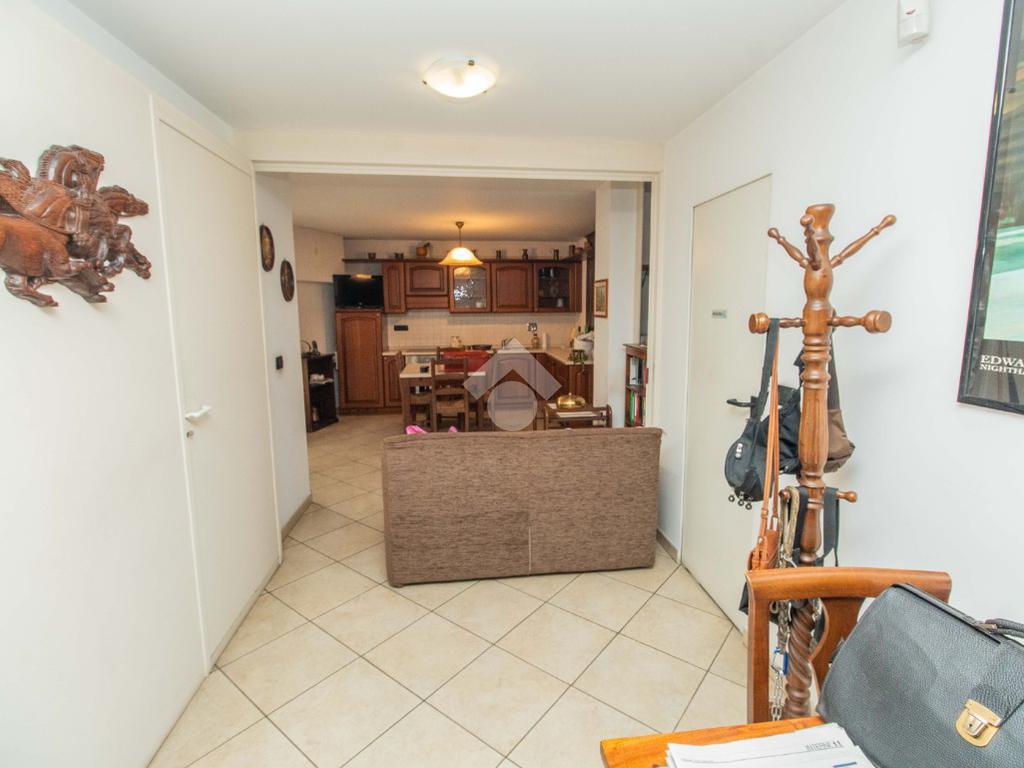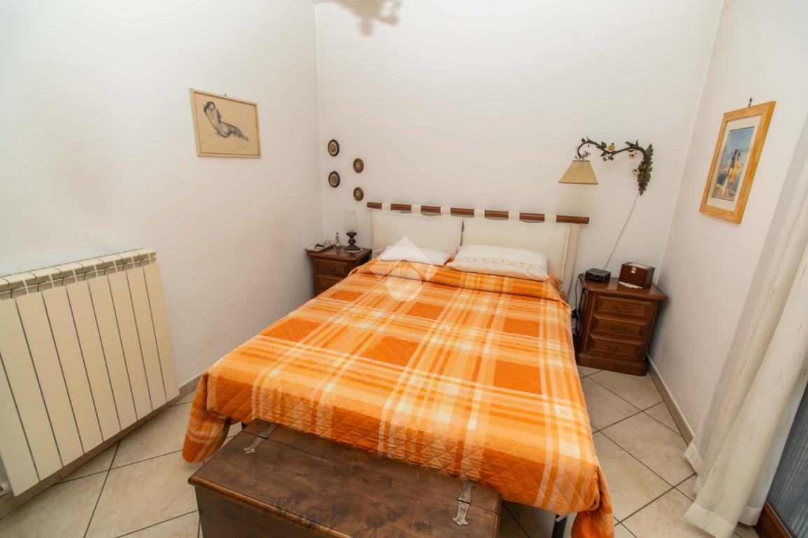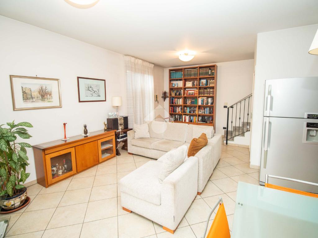 Al primo piano, soggiorno con cucina a vista, illuminato da due porte finestre e terrazzo completo di tende da sole. Sullo stesso livello troviamo un bagno finestrato con doccia e doppio lavabo, e una camera matrimoniale con affaccio sul balcone.